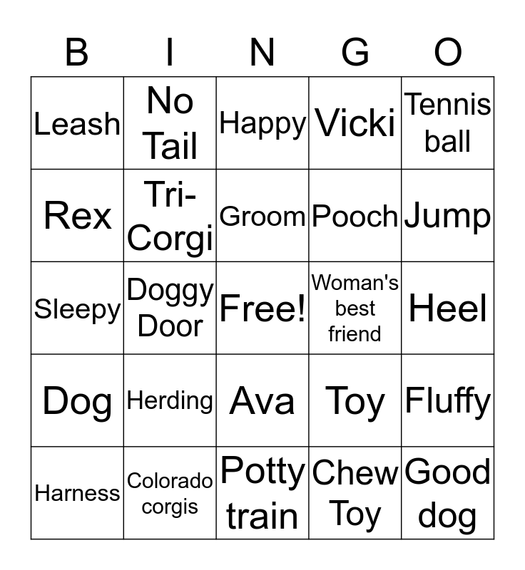 This bingo card has a free space and 54 words: Woof, Dog, Puppy, Corgi, Ava, Penelope, Vicki, Jules, Rex, Bark, Leash, Bowls, Colorado corgis, Harness, Collar, Potty train, Good dog, Pooch, Puppy breath, Heel, Toy, Squeaker, Woman's best friend, Tennis ball, Pembroke, No Tail, Instagram Famous, Crate, Play Time, Chew Toy, Bone, Sleep Time, 9 Weeks Old, Pup, Happy, Sneezy, Sleepy, Fluffy, Potato, Tri-Corgi, Fire Hydrant, Sit, Lie down, Cute, Herding, Treats, Puppy Food, Dog Bed, Groom, Doggy Door, Jump, Roll Over, Chewing and Dog Tag.