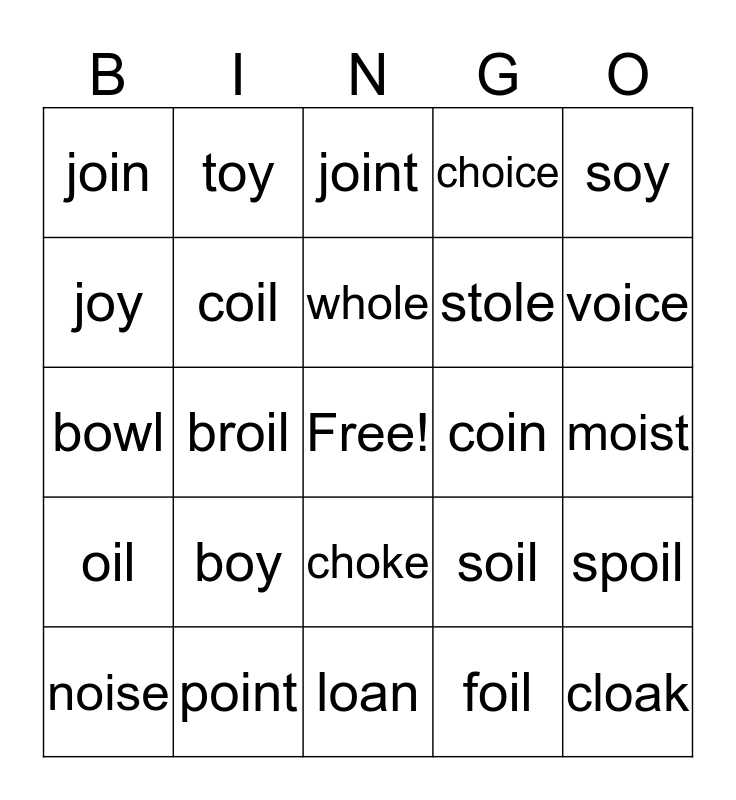 This bingo card has a free space and 24 words: boy, point, whole, noise, soy, join, joy, toy, coin, choke, stole, bowl, soil, spoil, coil, foil, moist, joint, voice, broil, cloak, oil, choice and loan.