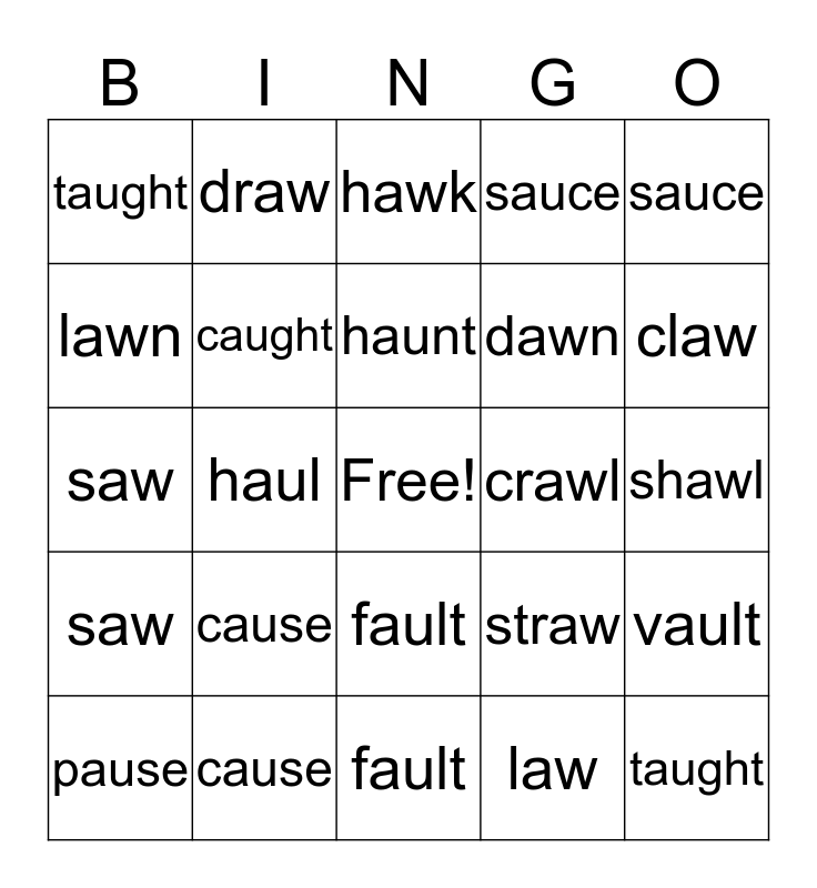 This bingo card has a free space and 25 words: saw, cause, fault, law, sauce, taught, draw, hawk, crawl, vault, lawn, caught, paws, straw, claw, pause, haul, haunt, dawn, shawl, saw, cause, fault, sauce and taught.