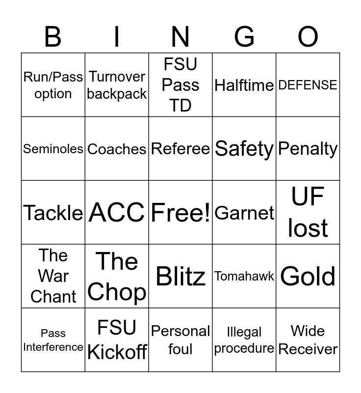 This bingo card has a free space and 44 words: Fumble, Wide Receiver, Offensive Line, Pass Interference, First Down, Illegal procedure, FSU Pass TD, Punter, DEFENSE, FSU Kickoff, Halftime, Garnet, Blitz, The Chop, Extra Point, Personal foul, Gavin drop, Tackle, Holding, Penalty, Turnover backpack, End Zone, Field Goal, Run/Pass option, FSU win, UF lost, Miami lost, Renegade, Tomahawk, The War Chant, Sack, Gold, Doak Campbell, Hail Mary, ACC, Chief Osceola, The Spear, Bobby Bowden, Referee, Seminoles, Safety, Special Teams, Coaches and Offside.