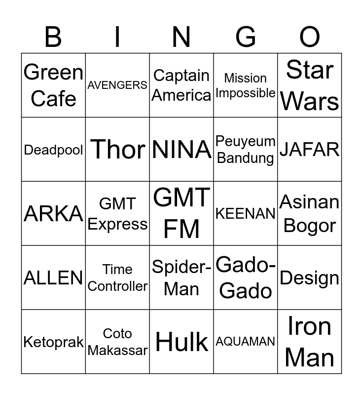 This bingo card has a free space and 24 words: Ketoprak, Time Controller, NINA, AQUAMAN, Star Wars, Green Cafe, AVENGERS, Captain America, KEENAN, Asinan Bogor, ARKA, Thor, Gado-Gado, Design, Deadpool, Coto Makassar, Hulk, Mission Impossible, JAFAR, ALLEN, GMT Express, Spider-Man, Peuyeum Bandung and Iron Man.