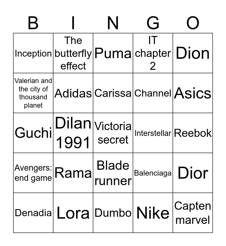 This bingo card has a free space and 24 words: Rama, Lora, Carissa, Denadia, Dion, Inception, Valerian and the city of thousand planet, The butterfly effect, Interstellar, Blade runner, Channel, Guchi, Balenciaga, Dior, Adidas, Nike, Reebok, Puma, Asics, Dilan 1991, Capten marvel, Avengers: end game, IT chapter 2 and Dumbo.