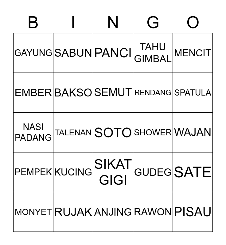 This bingo card has 25 words: KUCING, ANJING, SEMUT, MONYET, MENCIT, GAYUNG, EMBER, SABUN, SHOWER, SIKAT GIGI, RENDANG, NASI PADANG, GUDEG, SATE, BAKSO, PISAU, WAJAN, PANCI, SPATULA, TALENAN, SOTO, RUJAK, PEMPEK, TAHU GIMBAL and RAWON.