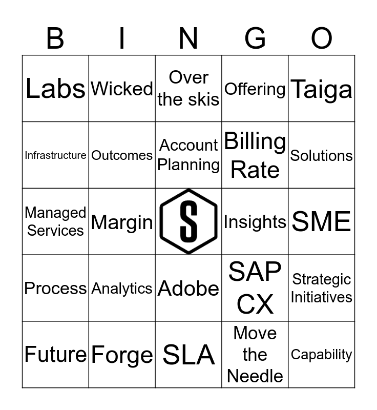 This bingo card has a free space and 33 words: Data Driven, The Guild, Margin, Delivery, Process, Outcomes, Taiga, Future, Wicked, People, Account Planning, Over the skis, The key here is, Laser Focused, Insights, Solutions, Forge, Managed Services, Analytics, SAP CX, Adobe, Innovation, Labs, SME, SLA, Capability, Offering, Billing Rate, Infrastructure, Strategic Initiatives, Progress not Perfection, Move the Needle and KPI.
