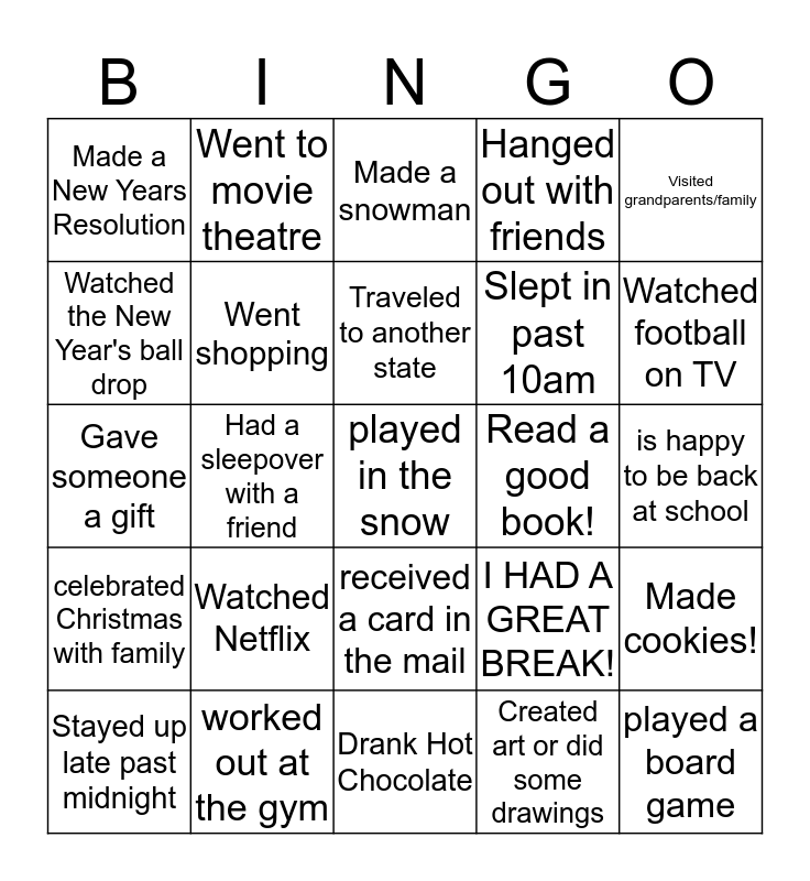 This bingo card has 25 words: Watched Netflix, Drank Hot Chocolate, Traveled to another state, Stayed up late past midnight, Visited grandparents/family, Made a New Years Resolution, Watched the New Year's ball drop, Went to movie theatre, Read a good book!, received a card in the mail, Slept in past 10am, Gave someone a gift, I HAD A GREAT BREAK!, Made cookies!, Went shopping, played a board game, is happy to be back at school, Made a snowman, Watched football on TV, Had a sleepover with a friend, played in the snow, worked out at the gym, celebrated Christmas with family, Hanged out with friends and Created art or did some drawings.