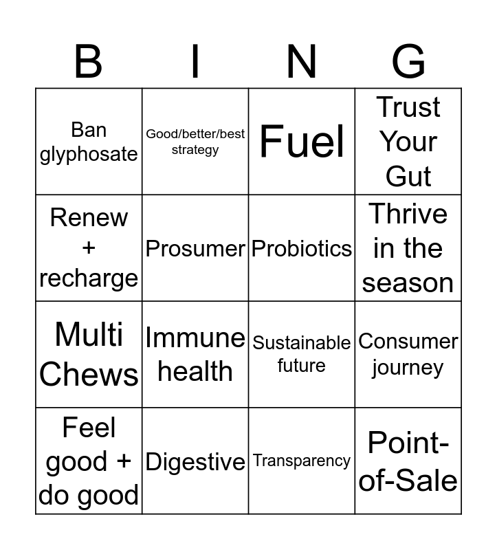 This bingo card has 61 words: Free!, Nutrition with Ambition, Innovation, Point-of-Sale, Dr. Tieraona Low Dog, Danny Seo, Probiotics, Protein Powders, Multi Chews, Blood Builder Liquid Iron, Trust Your Gut, Omni-Channel, Prosumer, Nourish a world in nutrition crisis, Social impact, Ban glyphosate, Feel good + do good, Renew + recharge, Work hard, play hard, Thrive in the season, Digestive, Fuel, Energy, Family health, Deeper connections with food, Dynamic Dani, Explorer Eli, Holistic Hannah, Immune health, Regenerative agriculture, Soil Health, Landing page, Digestive health landing page, Purity promise, Good/better/best strategy, Personalized nutrition, Need state, Consumer journey, Farm partners, Sustainable future, Email marketing, Content marketing, Transparency, Quality, FoodState Nutrients, Brave, Trust/Trustworthy, Grateful, Fun, Healthcare practitioners (HCP), B Corp, Activism, Channel management, New branding, DTC/Digital marketing, Pronatal, E-Tail, Whole food, Demo program, ExpertVoice and Display Promotions.