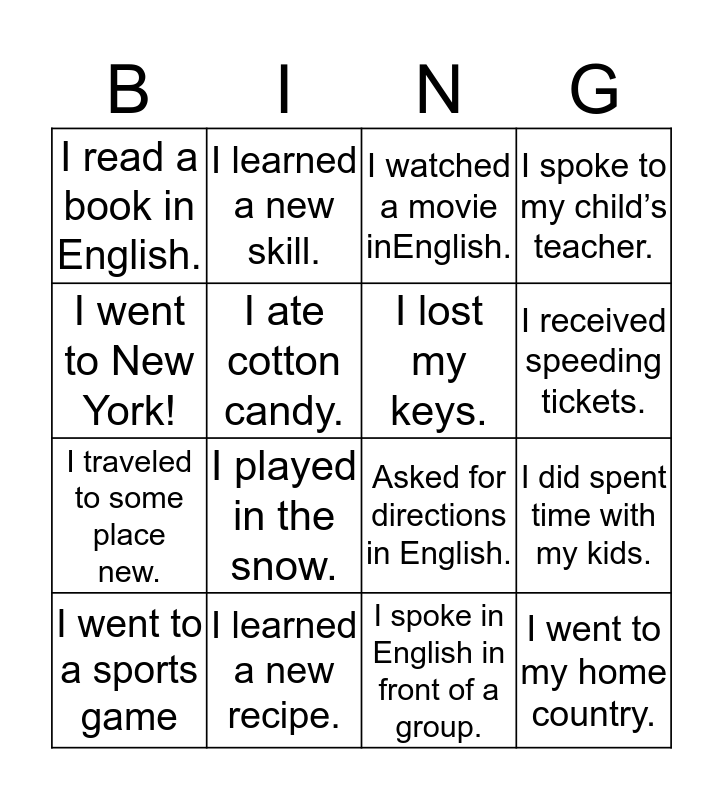 This bingo card has 16 words: I learned a new recipe., I did spent time with my kids., I watched a movie inEnglish., I read a book in English., I traveled to some place new., I learned a new skill., Asked for directions in English., I spoke in English in front of a group., I went to New York!, I ate cotton candy., I went to a sports game, I spoke to my child’s teacher., I played in the snow., I received speeding tickets., I lost my keys. and I went to my home country..