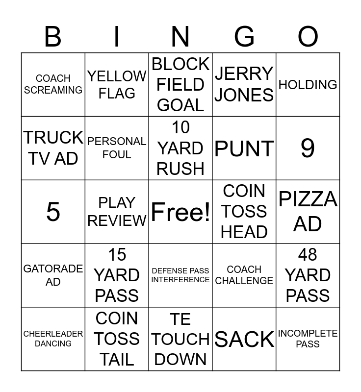 This bingo card has a free space and 49 words: FAN TALKING ON PHONE, SODA TV AD, TD CATCH, SACK, PIZZA AD, FUMBLE, YELLOW FLAG, RED FLAG, PUNT, FIELD GOAL, TRUCK TV AD, PLAY REVIEW, COACH CHALLENGE, INCOMPLETE PASS, RB TOUCHDOWN, OFFENSE PASS INTERFERENCE, BLOCK FIELD GOAL, COIN TOSS HEAD, PASS INTERFERENCE, COACH SCREAMING, COIN TOSS TAIL, TE TOUCH DOWN, JERRY JONES, HOLDING, MISS FIELD GOAL, 15 YARD PASS, 10 YARD RUSH, SCREEN PASS, 48 YARD PASS, GATORADE AD, DEFENSIVE HOLDING, DEFENSE PASS INTERFERENCE, 25 YARD RUSH, FALSE START, CHEERLEADER DANCING, 7, 1, 0, 9, 2, 4, 8, 6, 3, 5, PERSONAL FOUL, KICK RETURNED TD, PUNT RETURNED TD and FAN PAINTED FACE.
