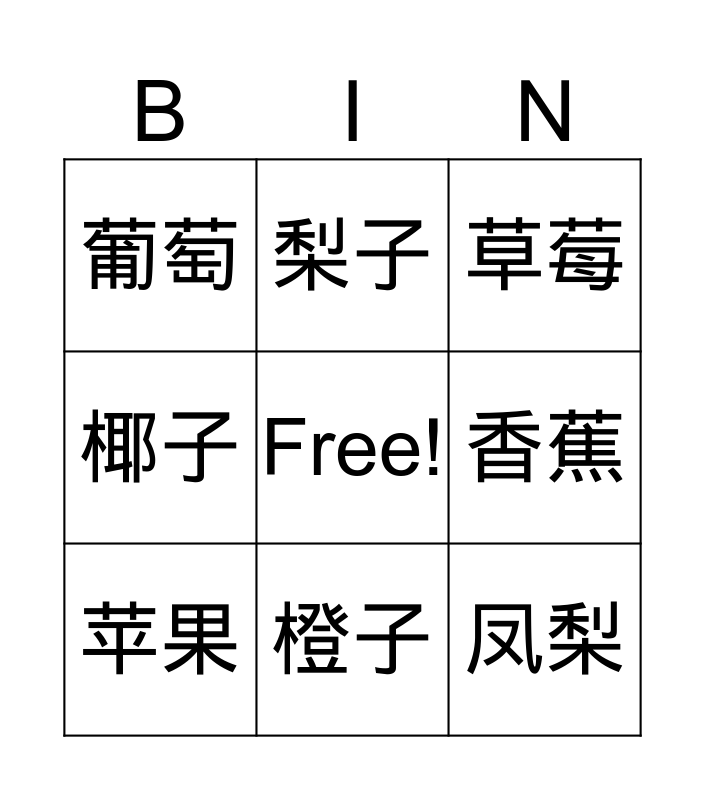 This bingo card has a free space and 8 words: 香蕉, 草莓, 梨子, 苹果, 葡萄, 凤梨, 椰子 and 橙子.