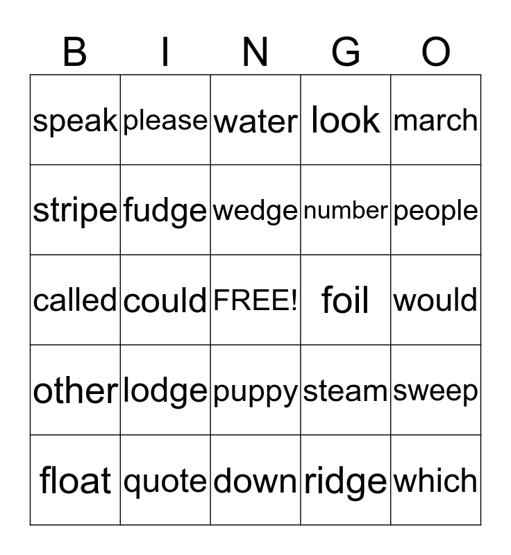 This bingo card has a free space and 24 words: lodge, quote, wedge, float, march, speak, stripe, please, foil, puppy, number, called, steam, sweep, fudge, ridge, would, water, people, could, which, other, look and down.