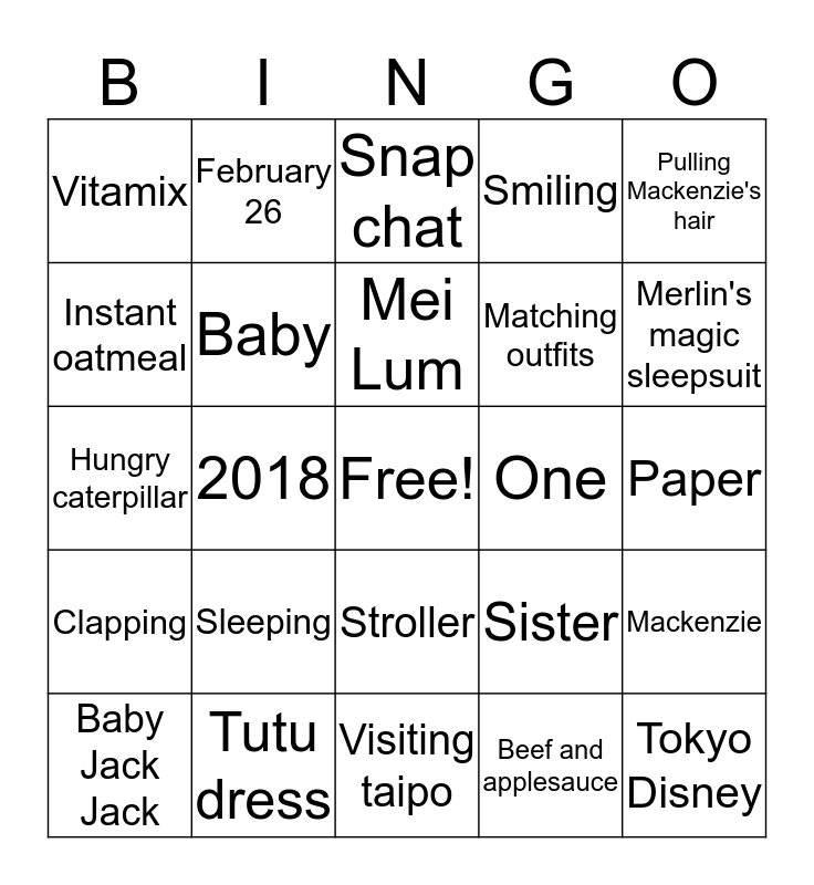 This bingo card has a free space and 67 words: Kaiser hospital, Baba, Nainai, Mackenzie, Frozen puzzle, Scavenger hunt, February 26, Samurai ice cream, Mei Lum, Ergo, Stroller, Telephone, Paper, Pulling Mackenzie's hair, 7.? Lbs, Instant oatmeal, 2018, Vitamix, Rye rye, Matching outfits, Sleeping, Clapping, Smiling, Beef and applesauce, Carseat, Pacifier, Osaka, Tokyo, Merlin's magic sleepsuit, Swaddle me, Tokyo Disney, Tokyo sea, Osaka aquarium, Baby hat, Dr. Ueoka, Baby Jack Jack, Second born, Sister, Hungry caterpillar, Butterfly, Incredibles, Baby, One, Chinese, Scottish, Robertson, Hilo, Tutu dress, Crawling contest, Birthday, Snap chat, Aulani, Year of the dog, Picses, Puffs, Visiting taipo, Soft skin, Cries too much!, Smiley, Shampoo special, Grace, Daniel, Scot and Wehi's wedding, Aunty Kristy, Mamalu street, Born a day late and Uncle Graham.