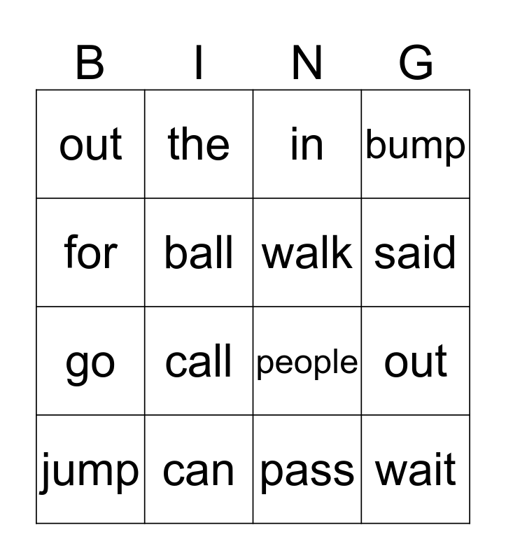 This bingo card has 16 words: can, out, in, out, go, the, people, pass, for, ball, jump, bump, call, said, walk and wait.