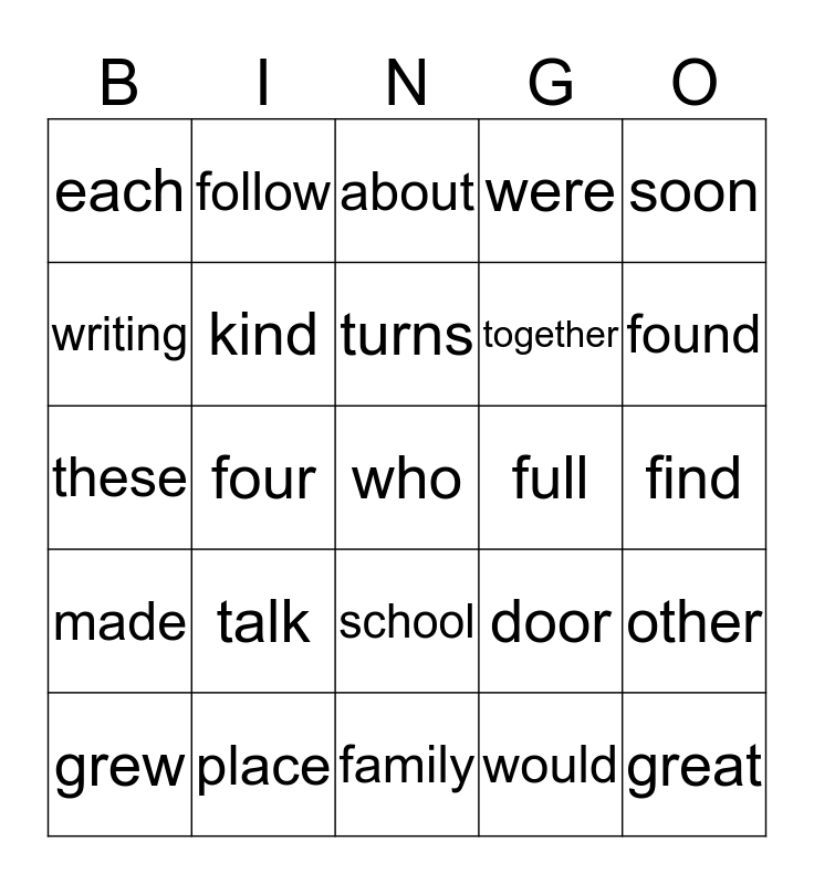 This bingo card has 25 words: talk, family, turns, grew, soon, each, writing, follow, full, school, together, these, door, other, kind, great, find, about, found, four, who, place, made, were and would.
