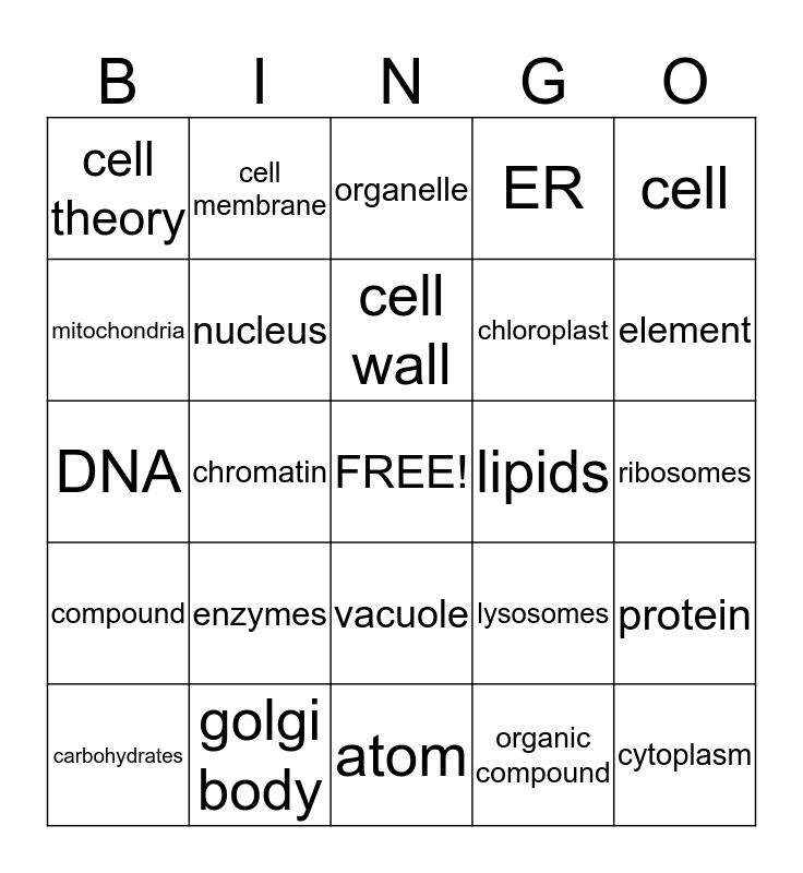 This bingo card has a free space and 24 words: enzymes, golgi body, cell wall, carbohydrates, cell, cell theory, mitochondria, cell membrane, lipids, vacuole, chloroplast, DNA, lysosomes, protein, nucleus, organic compound, ribosomes, organelle, element, chromatin, cytoplasm, compound, ER and atom.