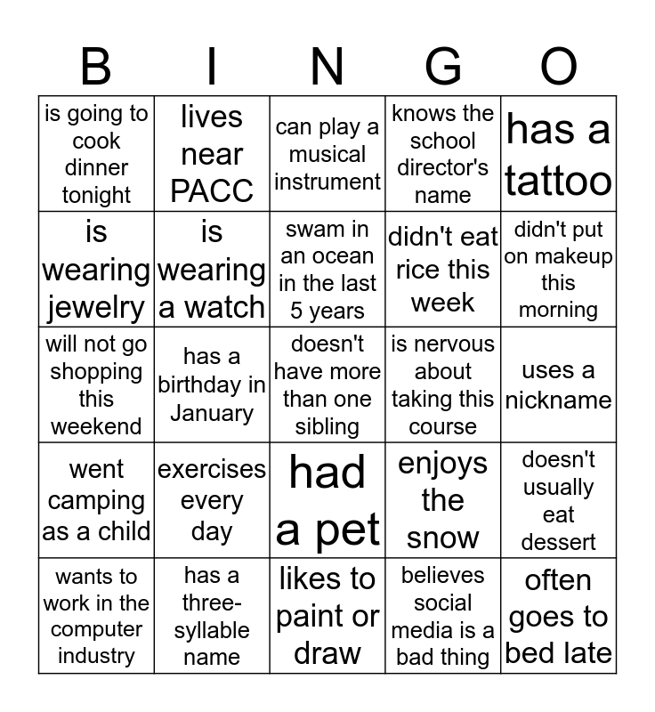 This bingo card has 25 words: exercises every day, likes to paint or draw, swam in an ocean in the last 5 years, wants to work in the computer industry, has a tattoo, is going to cook dinner tonight, is wearing jewelry, lives near PACC, is nervous about taking this course, had a pet, didn't eat rice this week, will not go shopping this weekend, enjoys the snow, doesn't usually eat dessert, is wearing a watch, often goes to bed late, uses a nickname, can play a musical instrument, didn't put on makeup this morning, has a birthday in January, doesn't have more than one sibling, has a three-syllable name, went camping as a child, knows the school director's name and believes social media is a bad thing.
