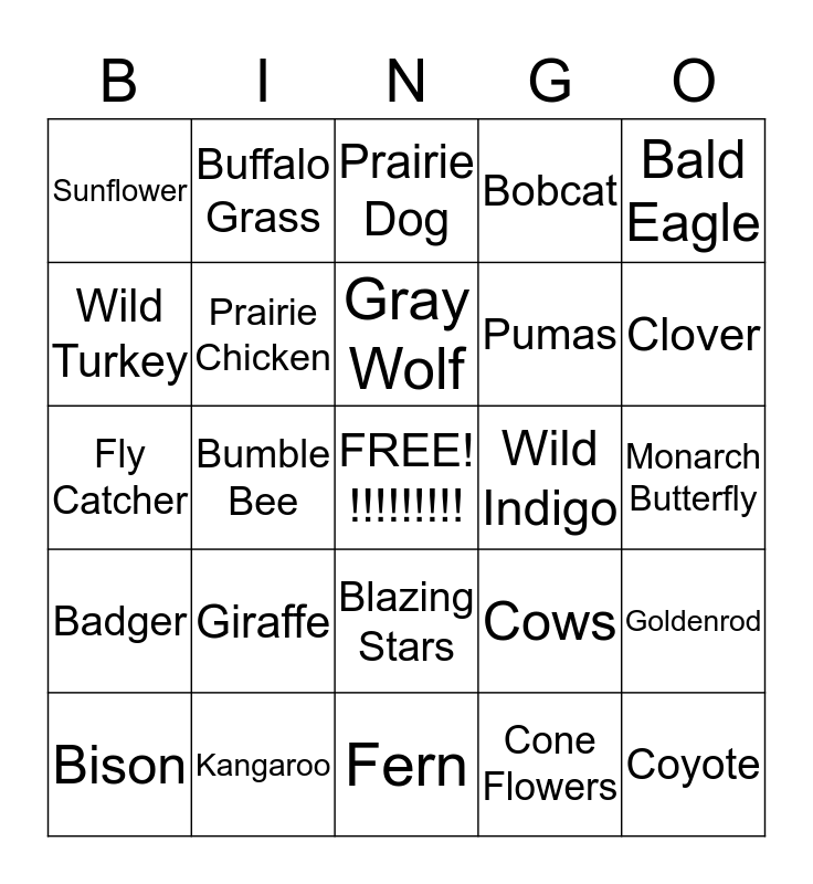 This bingo card has a free space and 24 words: Giraffe, Kangaroo, Gray Wolf, Bison, Bald Eagle, Sunflower, Wild Turkey, Buffalo Grass, Wild Indigo, Blazing Stars, Pumas, Fly Catcher, Cows, Goldenrod, Prairie Chicken, Cone Flowers, Monarch Butterfly, Prairie Dog, Clover, Bumble Bee, Coyote, Badger, Bobcat and Fern.