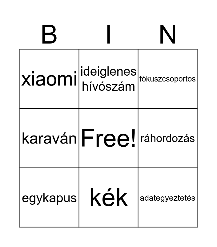 This bingo card has a free space and 9 words: egykapus, fókuszcsoportos, ideiglenes hívószám, karaván, xiaomi, ráhordozás, adategyeztetés, akkumulátor kapacitás and kék.