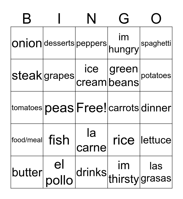 This bingo card has a free space and 24 words: fish, el pollo, ice cream, butter, spaghetti, onion, steak, desserts, carrots, la carne, green beans, tomatoes, rice, lettuce, grapes, im thirsty, dinner, peppers, potatoes, peas, las grasas, food/meal, im hungry and drinks.
