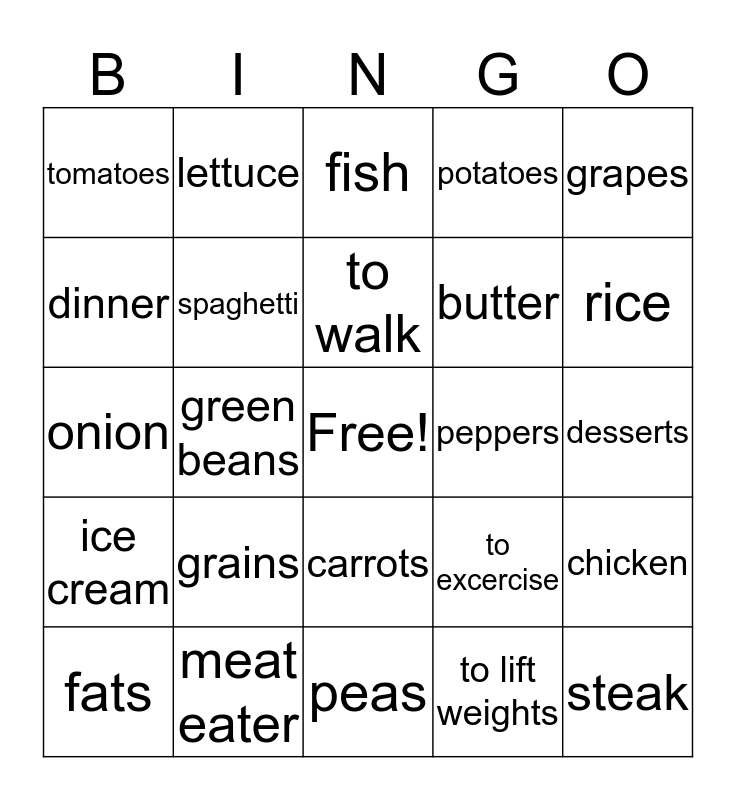 This bingo card has a free space and 24 words: grains, meat eater, to walk, fats, grapes, tomatoes, dinner, lettuce, peppers, carrots, butter, onion, to excercise, chicken, spaghetti, to lift weights, desserts, fish, rice, green beans, steak, ice cream, potatoes and peas.