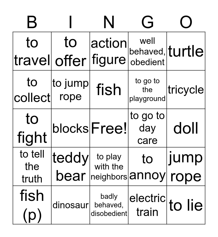 This bingo card has a free space and 24 words: teddy bear, dinosaur, fish, fish (p), turtle, to travel, to collect, to offer, to go to day care, to play with the neighbors, to go to the playground, to fight, to annoy, jump rope, to jump rope, electric train, doll, action figure, tricycle, blocks, to lie, to tell the truth, well behaved, obedient and badly behaved, disobedient.