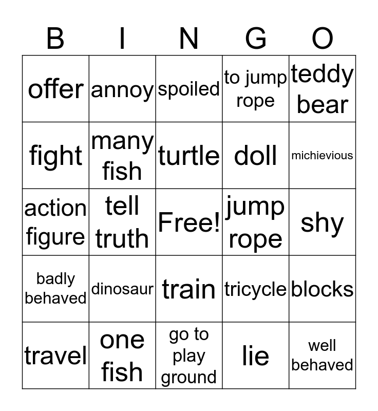 This bingo card has a free space and 24 words: dinosaur, one fish, turtle, travel, teddy bear, offer, fight, annoy, jump rope, train, doll, action figure, tricycle, blocks, many fish, lie, shy, spoiled, michievious, tell truth, well behaved, badly behaved, to jump rope and go to play ground.