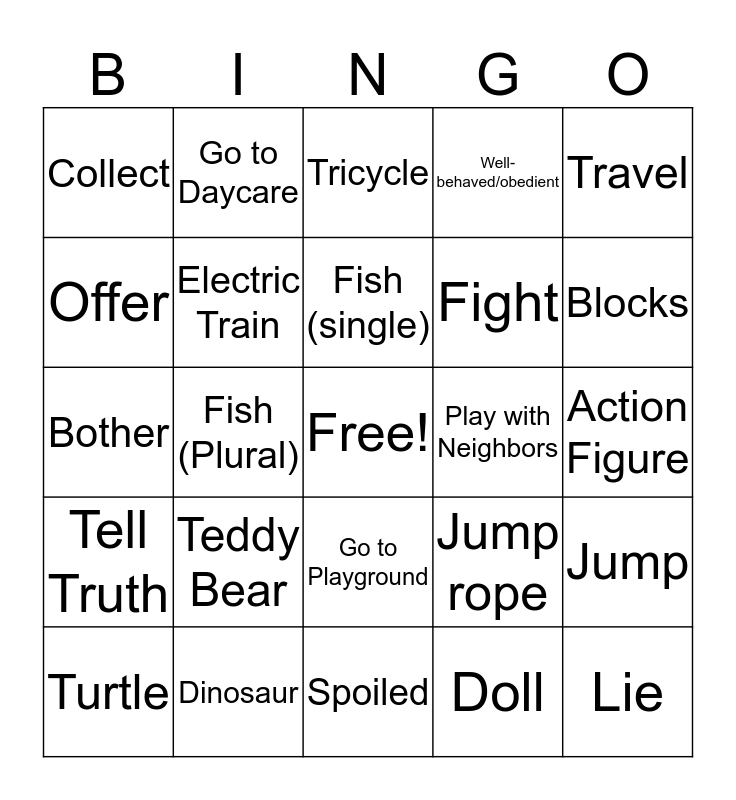 This bingo card has a free space and 24 words: Teddy Bear, Dinosaur, Fish (single), Turtle, Travel, Collect, Offer, Go to Daycare, Play with Neighbors, Go to Playground, Fight, Bother, Jump rope, Jump, Electric Train, Doll, Action Figure, Tricycle, Blocks, Fish (Plural), Lie, Tell Truth, Well-behaved/obedient and Spoiled.