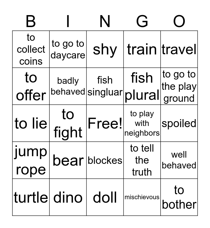 This bingo card has a free space and 24 words: bear, dino, fish singluar, turtle, travel, to collect coins, to offer, to go to daycare, to play with neighbors, blockes, fish plural, to lie, to tell the truth, well behaved, badly behaved, mischievous, spoiled, shy, to go to the play ground, to fight, to bother, jump rope, train and doll.