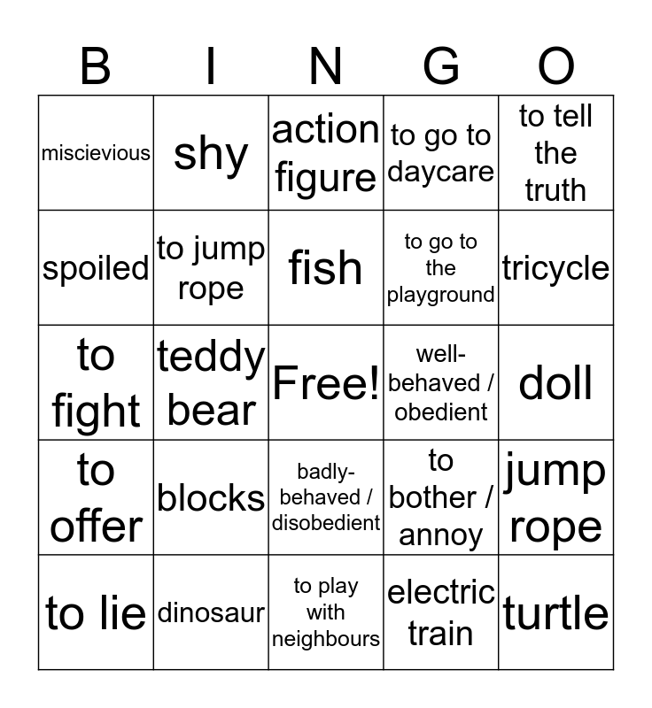 This bingo card has a free space and 24 words: blocks, dinosaur, fish, to lie, to tell the truth, miscievious, spoiled, shy, well-behaved / obedient, badly-behaved / disobedient, to go to the playground, to fight, to bother / annoy, jump rope, to jump rope, electric train, doll, action figure, tricycle, teddy bear, turtle, to offer, to go to daycare and to play with neighbours.
