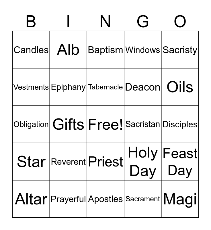 This bingo card has a free space and 24 words: Reverent, Prayerful, Tabernacle, Altar, Sacristy, Candles, Vestments, Alb, Sacristan, Priest, Deacon, Obligation, Holy Day, Feast Day, Epiphany, Sacrament, Disciples, Baptism, Oils, Gifts, Magi, Star, Windows and Apostles.