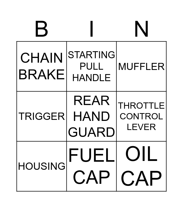 This bingo card has a free space and 16 words: SAWCHAIN, BAR, MUFFLER, CHAIN BRAKE, FRONT HANDLE, STARTING PULL HANDLE, AIR FILTER COVER, PROTECTIVE CASE, OIL CAP, THROTTLE CONTROL LEVER, SAFETY SWITCH, TRIGGER, FUEL TANK, FUEL CAP, HOUSING and OIL RESERVOIR.