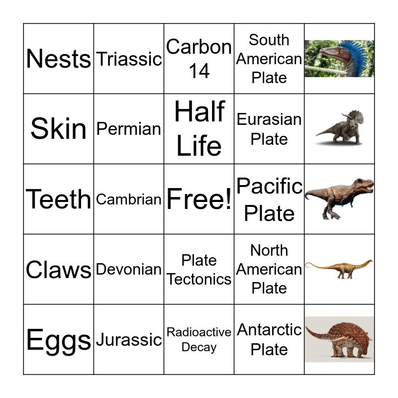 This bingo card has 6 images, a free space and 23 words: Bones, Jurassic, Carbon 14, African Plate, Nests, Permian, Half Life, Pacific Plate, Eggs, Cambrian, Antarctic Plate, Teeth, Tertiary, Radioactive Decay, North American Plate, Claws, Devonian, Fossils, Eurasian Plate, Skin, Triassic, Plate Tectonics and South American Plate.