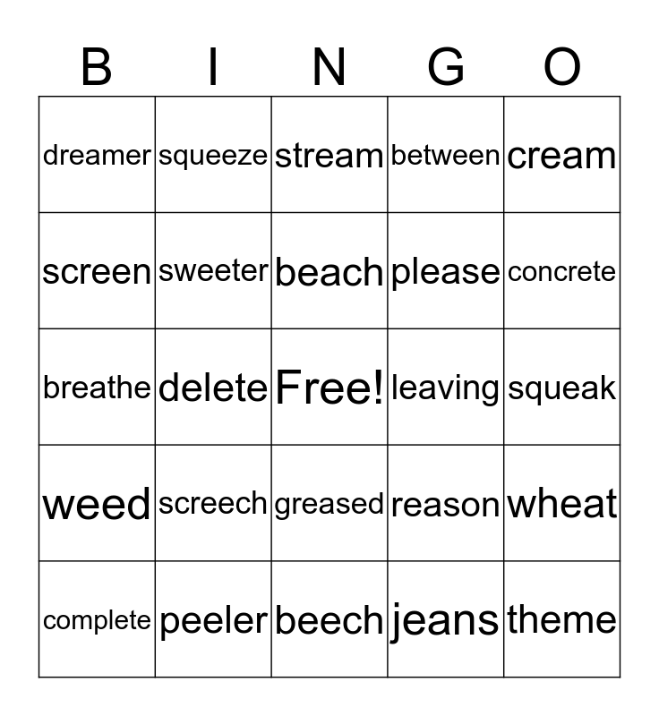 This bingo card has a free space and 25 words: screech, beech, beach, complete, cream, dreamer, screen, squeeze, leaving, greased, please, breathe, reason, wheat, sweeter, squeal, squeak, stream, concrete, delete, theme, peeler, weed, between and jeans.