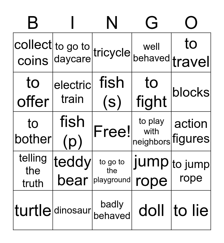 This bingo card has a free space and 24 words: teddy bear, dinosaur, fish (s), turtle, to travel, collect coins, to offer, to go to daycare, to play with neighbors, to go to the playground, to fight, to bother, jump rope, to jump rope, electric train, doll, action figures, tricycle, blocks, fish (p), to lie, telling the truth, well behaved and badly behaved.