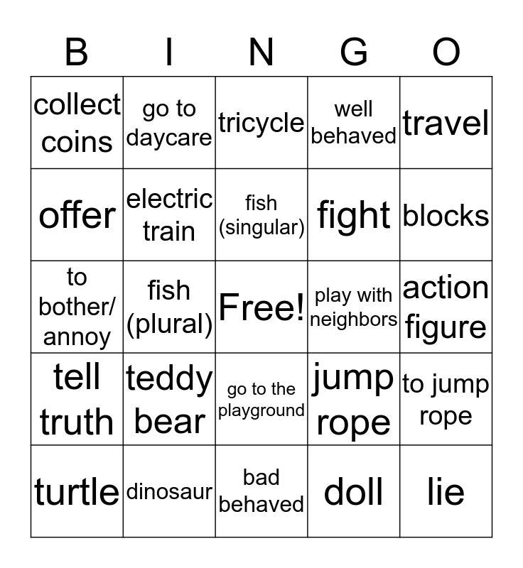 This bingo card has a free space and 24 words: teddy bear, dinosaur, fish (singular), turtle, travel, collect coins, offer, go to daycare, play with neighbors, go to the playground, fight, to bother/ annoy, jump rope, to jump rope, electric train, doll, action figure, tricycle, blocks, fish (plural), lie, tell truth, well behaved and bad behaved.