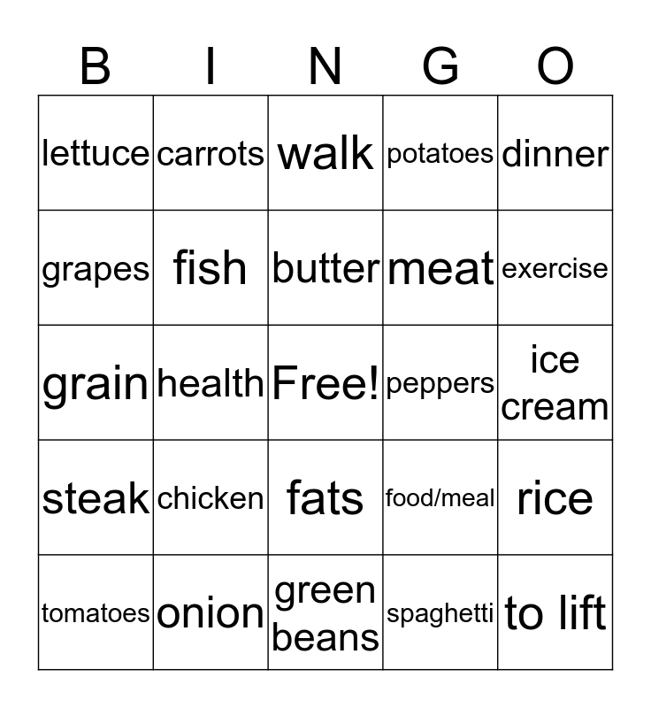 This bingo card has a free space and 24 words: chicken, onion, butter, tomatoes, dinner, lettuce, grapes, carrots, peppers, fats, meat, grain, food/meal, rice, fish, spaghetti, ice cream, walk, exercise, health, to lift, steak, potatoes and green beans.