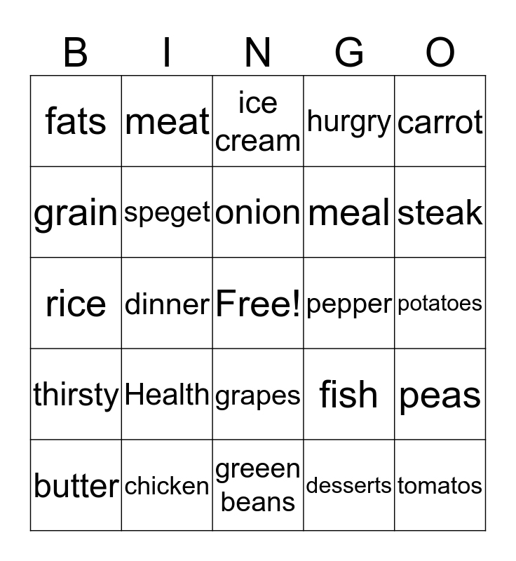This bingo card has a free space and 24 words: Health, chicken, onion, butter, carrot, fats, grain, meat, pepper, grapes, meal, rice, fish, peas, speget, desserts, potatoes, ice cream, steak, dinner, tomatos, thirsty, hurgry and greeen beans.
