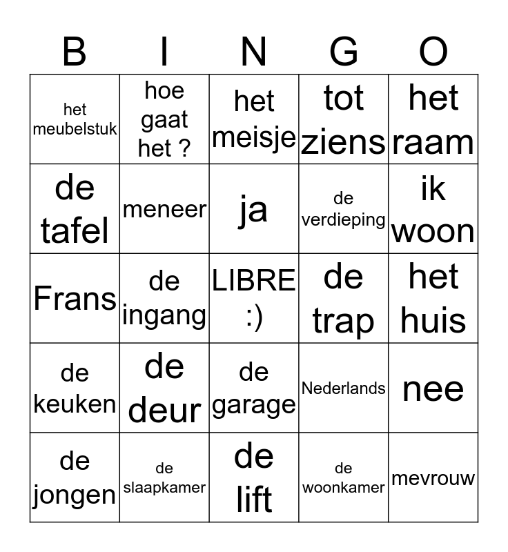 This bingo card has a free space and 29 words: de jongen, hoi, de ingang, de stoel, het meubelstuk, het meisje, meneer, de deur, de trap, de slaapkamer, het huis, mevrouw, de lift, de woonkamer, ik woon, er is/er zijn, de garage, de keuken, het raam, Frans, Nederlands, het bed, de verdieping, de tafel, tot ziens, hoe gaat het ?, nee, ja and ik heet.