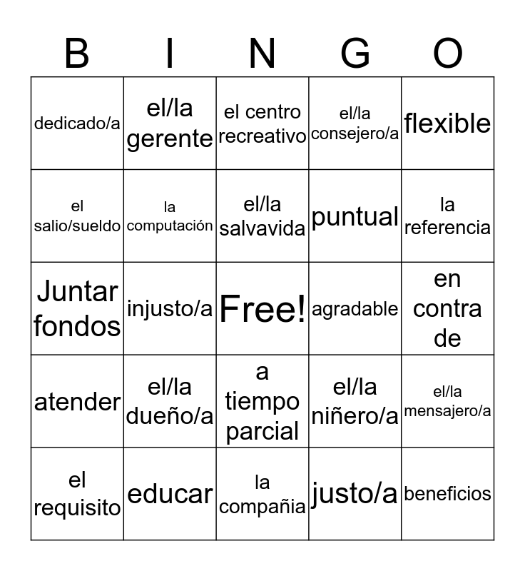 This bingo card has a free space and 49 words: el anuncio clasificado, beneficios, el/a cliente, la compañia, el/la dueño/a, la fecha de nacimiento, el/la gerente, el puesto, el salio/sueldo, la solicitud de empleo, la computación, el/la consejero/a, el/la mensajero/a, el/la niñero/a, el/la repartidor/a, el/la recepcionista, el/la salvavida, agradable, amable, flexible, injusto/a, justo/a, dedicado/a, puntual, la responsabilidad, la referencia, el requisito, a tiempo completo, a tiempo parcial, atender, solicitar, cumplir con, encargarse, beneficiar, educar, organizar, garantizar, a favor de, en contra de, me encantaría, me interesaría, el/la ciudadano/a, presentarse, la gente sin hogar, Juntar fondos, el centro recreativo, el centro recreativo, la marcha and la ley.