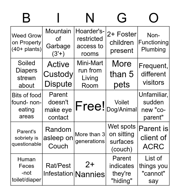 This bingo card has a free space and 24 words: Random asleep on Couch, Rat/Pest Infestation, Mini-Mart run from Living Room, Human Feces -not toilet/diaper, Non-Functioning Plumbing, Weed Grow on Property (40+ plants), Soiled Diapers strewn about, Mountain of Garbage (3'+), Voilet Dog/Animal, More than 3 generations, More than 5 pets, Bits of food found- non-eating areas, Wet spots on sitting surfaces (couch), Parent is client of ACRC, Active Custody Dispute, Parent indicates they're "hiding", Unfamiliar, sudden new "co-parent", Hoarder's- restricted access to rooms, Frequent, different visitors, Parent doesn't make eye contact, List of things you "cannot" say, Parent's sobriety is questionable, 2+ Foster children present and 2+ Nannies.