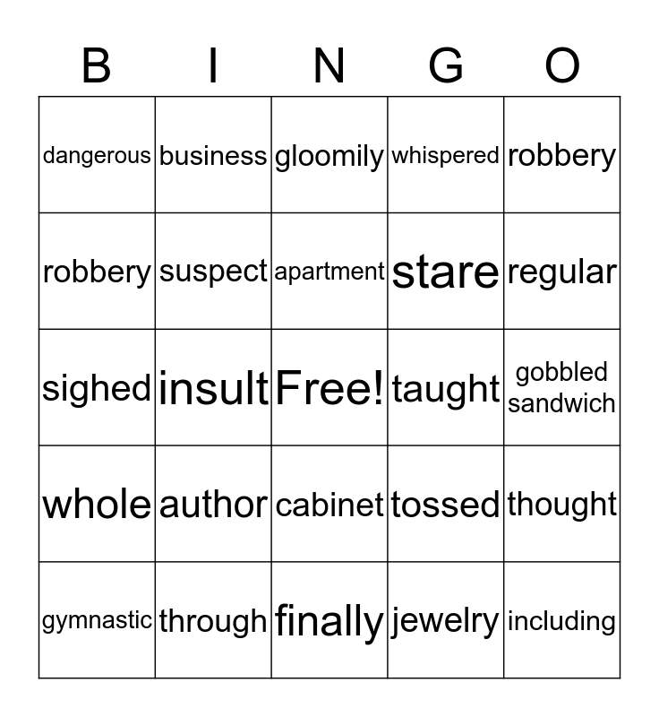 This bingo card has a free space and 24 words: author, through, apartment, gymnastic, robbery, dangerous, robbery, business, taught, cabinet, stare, sighed, tossed, thought, suspect, jewelry, gobbled sandwich, gloomily, regular, insult, including, whole, whispered and finally.