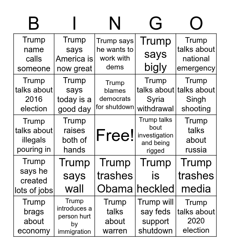 This bingo card has a free space and 24 words: Trump says wall, Trump introduces a person hurt by immigration, Trump blames democrats for shutdown, Trump brags about economy, Trump talks about national emergency, Trump name calls someone, Trump talks about 2016 election, Trump says America is now great, Trump talks bout investigation and being rigged, Trump trashes Obama, Trump talks about Syria withdrawal, Trump talks about illegals pouring in, Trump is heckled, Trump trashes media, Trump says today is a good day, Trump will say feds support shutdown, Trump talks about russia, Trump says he wants to work with dems, Trump talks about Singh shooting, Trump raises both of hands, Trump talks about 2020 election, Trump says he created lots of jobs, Trump says bigly and Trump talks about warren.