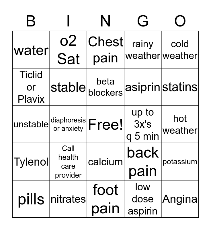 This bingo card has a free space and 24 words: Call health care provider, nitrates, beta blockers, pills, cold weather, water, Ticlid or Plavix, o2 Sat, up to 3x's q 5 min, calcium, asiprin, unstable, back pain, potassium, stable, low dose aspirin, hot weather, Chest pain, statins, diaphoresis or anxiety, Angina, Tylenol, rainy weather and foot pain.