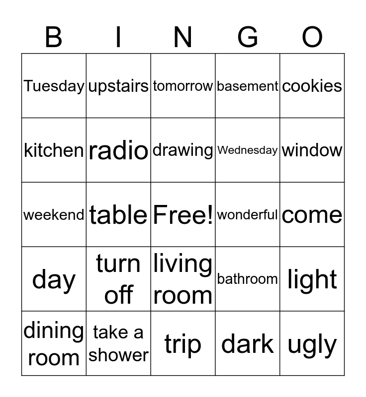 This bingo card has a free space and 24 words: turn off, take a shower, drawing, dining room, cookies, Tuesday, kitchen, upstairs, wonderful, living room, Wednesday, weekend, bathroom, light, radio, dark, come, tomorrow, window, table, ugly, day, basement and trip.