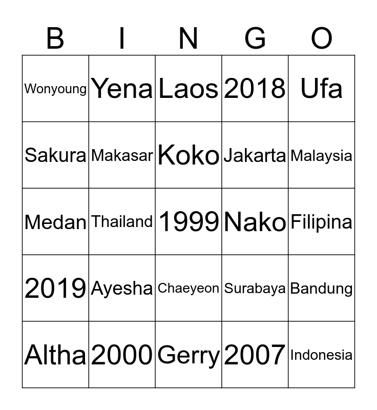 This bingo card has 25 words: Ayesha, Gerry, Koko, Altha, Ufa, Wonyoung, Sakura, Yena, Nako, Chaeyeon, Jakarta, Medan, Surabaya, Bandung, Makasar, Indonesia, Filipina, Laos, Malaysia, Thailand, 1999, 2000, 2019, 2018 and 2007.
