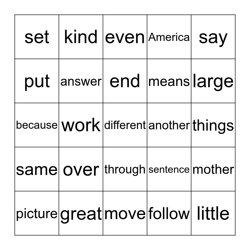 This bingo card has a free space and 24 words: over, great, end, picture, say, set, put, kind, another, through, means, because, sentence, mother, answer, follow, things, even, large, work, little, same, America and move.