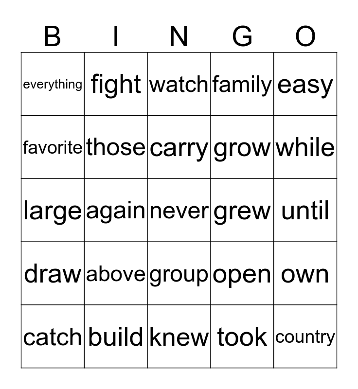 This bingo card has a free space and 24 words: above, build, carry, catch, easy, everything, favorite, fight, grew, group, grow, large, open, own, those, took, until, watch, while, again, country, draw, family and knew.