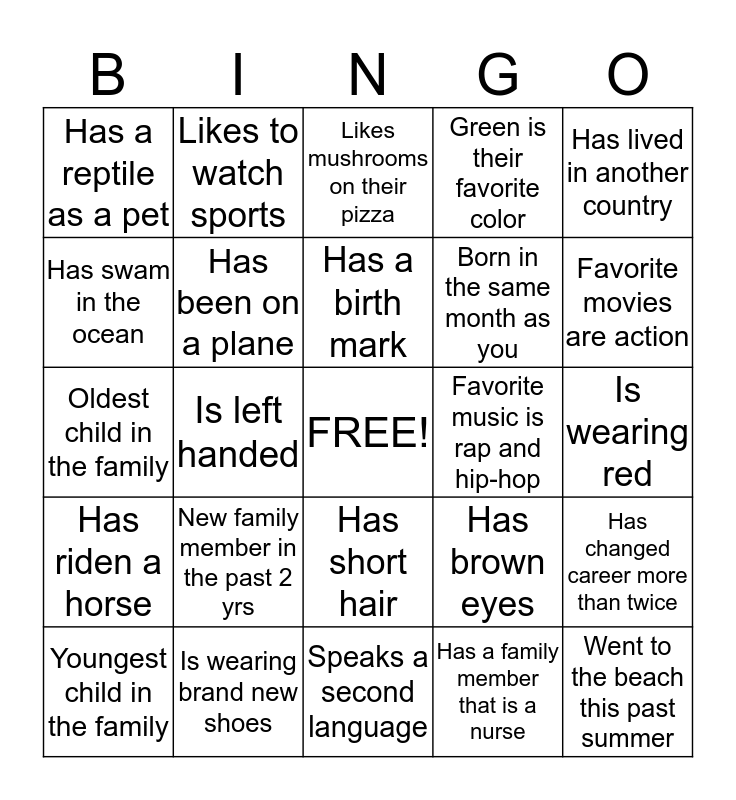 This bingo card has a free space and 24 words: New family member in the past 2 yrs, Is wearing brand new shoes, Has a birth mark, Youngest child in the family, Has lived in another country, Has a reptile as a pet, Has swam in the ocean, Likes to watch sports, Favorite music is rap and hip-hop, Has short hair, Born in the same month as you, Oldest child in the family, Has brown eyes, Has changed career more than twice, Has been on a plane, Has a family member that is a nurse, Is wearing red, Likes mushrooms on their pizza, Favorite movies are action, Is left handed, Went to the beach this past summer, Has riden a horse, Green is their favorite color and Speaks a second language.