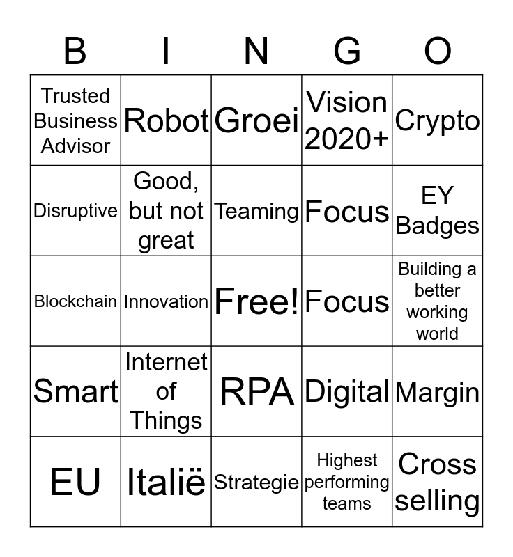 This bingo card has a free space and 30 words: Italië, Motor, Innovation, Disruption, Trusted Business Advisor, Groei, Good, but not great, RPA, Focus, Strategie, Building a better working world, Cross selling, Highest performing teams, Pro actief, EY Badges, Exceptional Client Service, Digital, Smart, Internet of Things, Crypto, Blockchain, Analytics, Robot, Focus, Disruptive, Vision 2020+, Margin, EU, Teaming and Bitcoin.