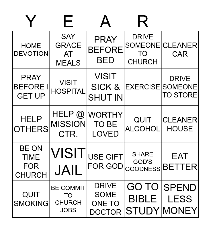 This bingo card has a free space and 28 words: EAT BETTER, READ BIBLE DAILY, EXERCISE, GO TO BIBLE STUDY, PRAY BEFORE I GET UP, PRAY BEFORE BED, SAY GRACE AT MEALS, BE ON TIME FOR CHURCH, QUIT ALCOHOL, QUIT SMOKING, HELP OTHERS, DRIVE SOMEONE TO CHURCH, BE COMMIT TO CHURCH JOBS, DRIVE SOME ONE TO DOCTOR, DRIVE SOMEONE TO STORE, VISIT NURSING HOME, VISIT JAIL, VISIT HOSPITAL, VISIT SICK & SHUT IN, USE GIFT FOR GOD, HOME DEVOTION, BE KINDER, SPEND LESS MONEY, HELP @ MISSION CTR., CLEANER HOUSE, SHARE GOD'S GOODNESS, CLEANER CAR and SPEAK BOLD IN CHRIST.