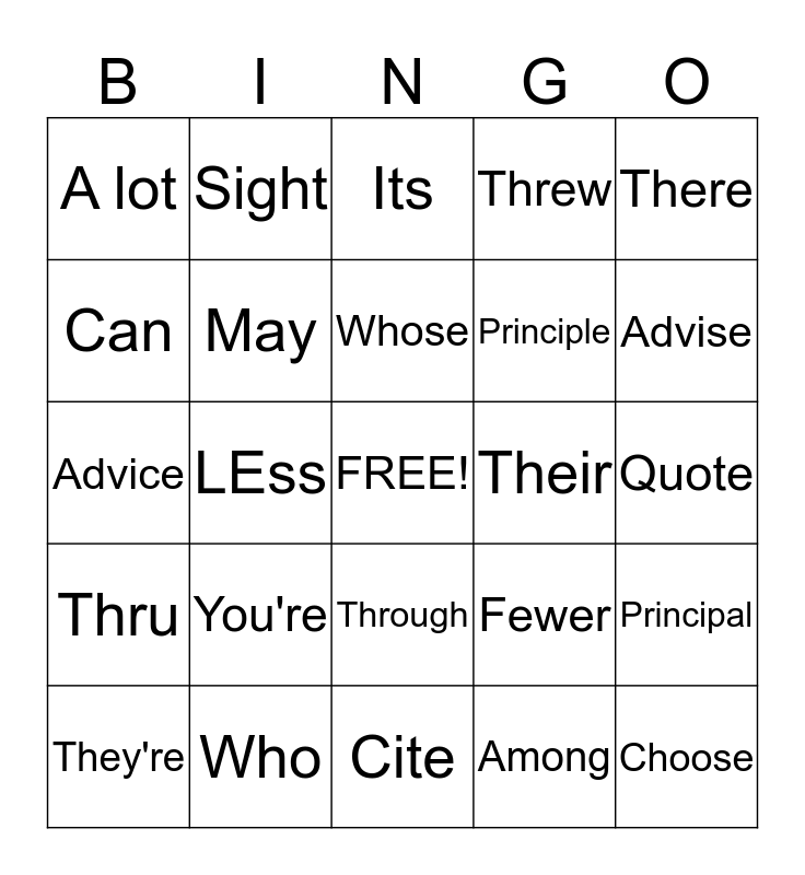 This bingo card has a free space and 24 words: You're, Who, Whose, They're, There, A lot, Can, Sight, Their, Through, Principle, Advice, Fewer, Principal, May, Among, Quote, Its, Advise, LEss, Choose, Thru, Threw and Cite.
